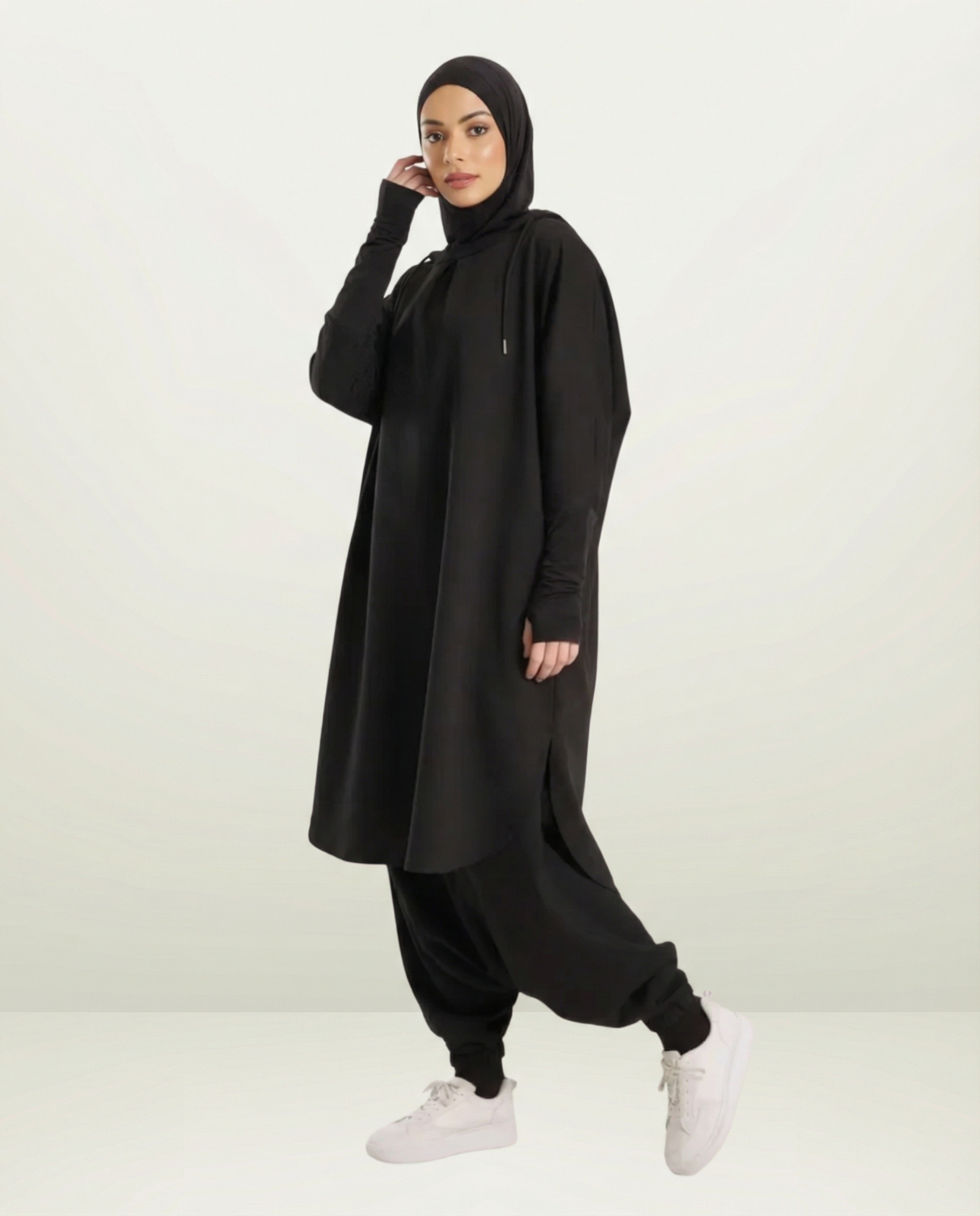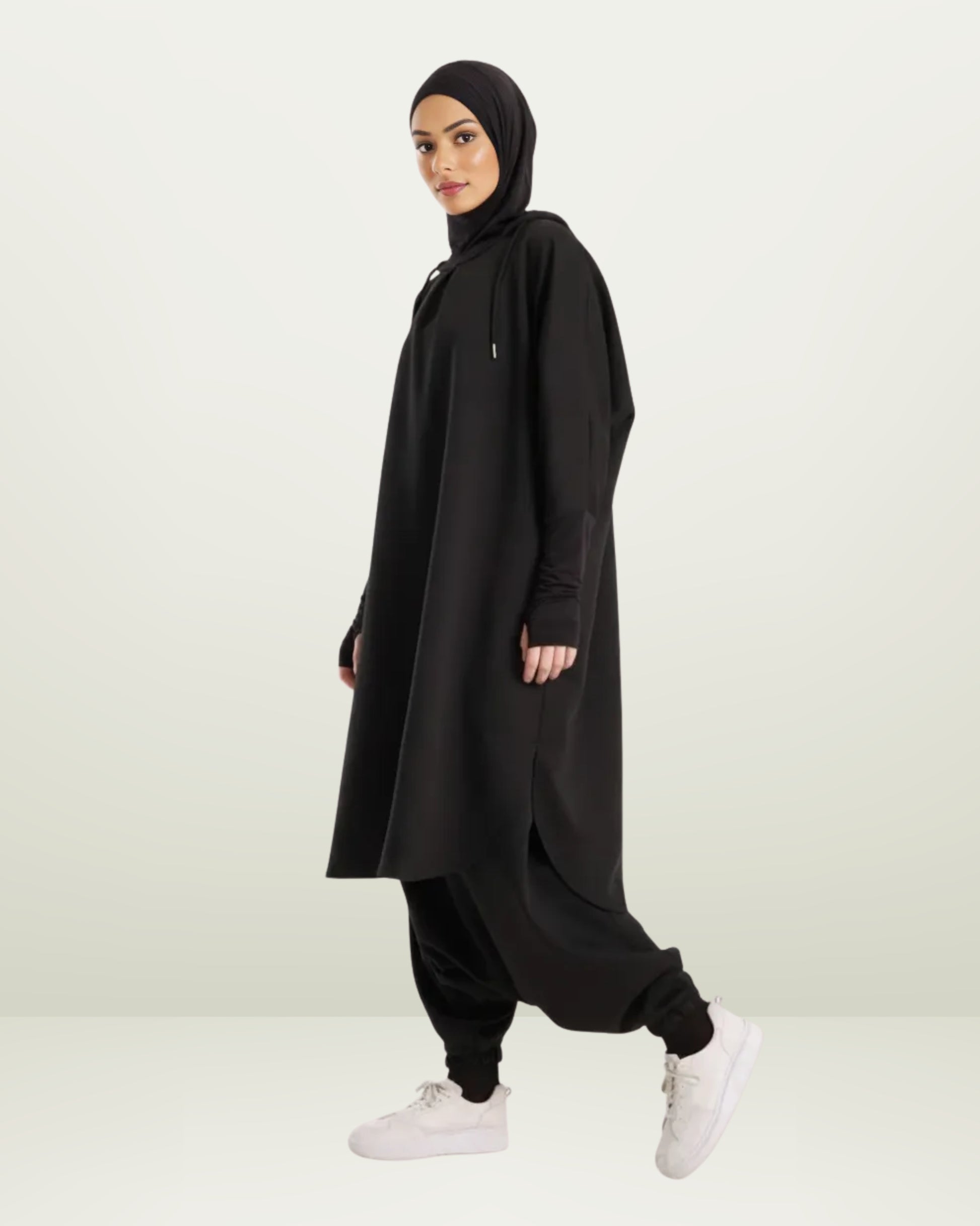 Ne choisissez plus entre le sport et vos valeurs. Cet ensemble noir est spécialement conçu pour vous offrir une couverture totale pendant vos entraînements. Une coupe intelligente qui vous permet de bouger, courir et vous étirer sans aucune gêne.